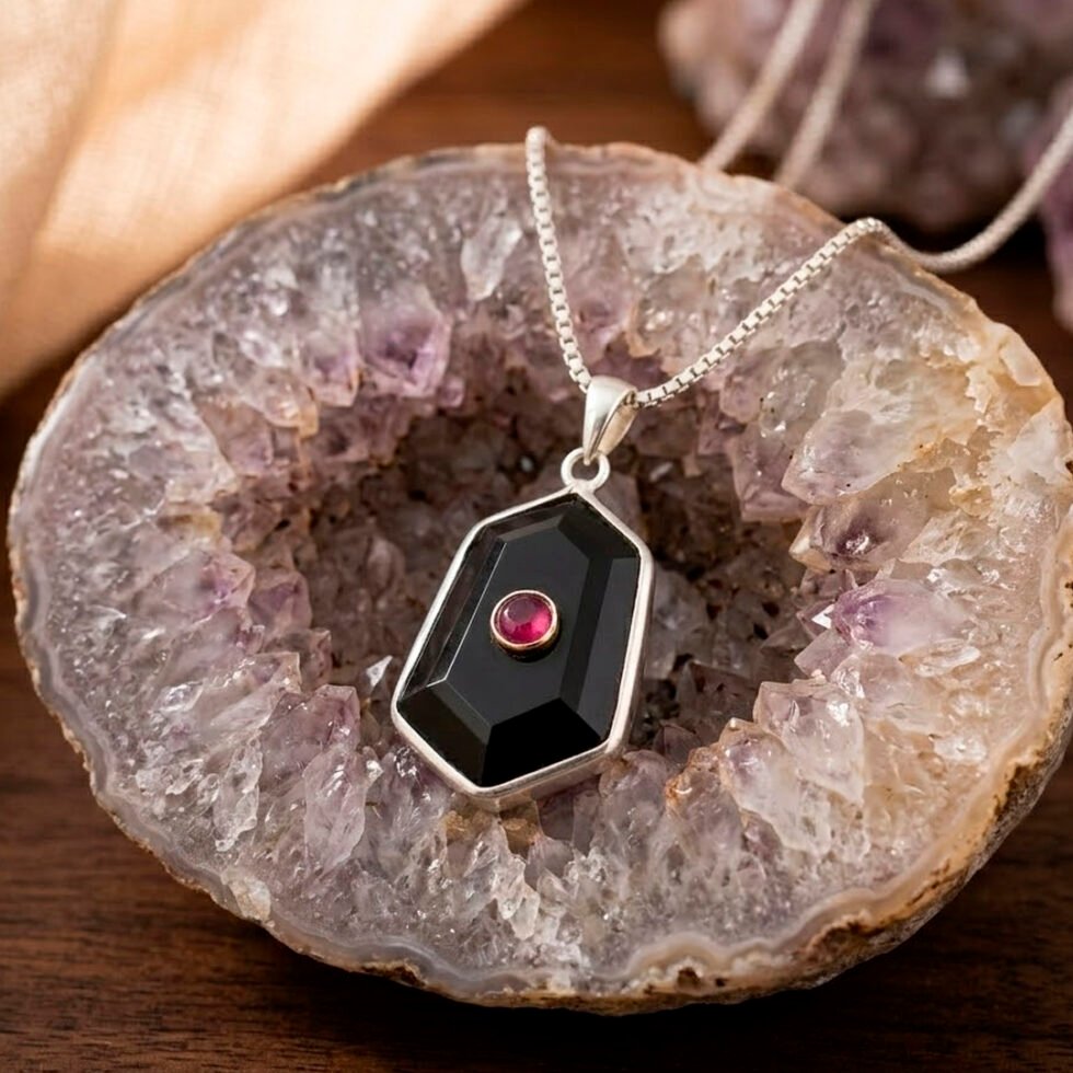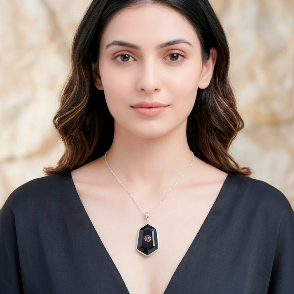 Elegant Black Onyx and Ruby geometric pendant