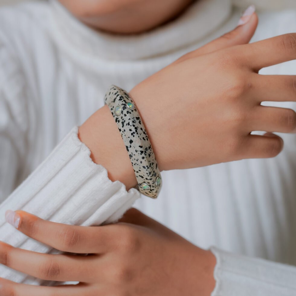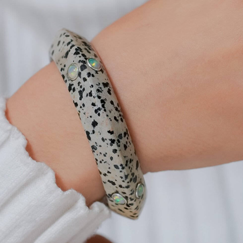 A beautiful bangle featuring unique Dalmatian stone paired with glowing moonstone accents. Stylish and eye-catching, this piece blends earthy charm with subtle elegance—perfect for everyday wear or special occasions.