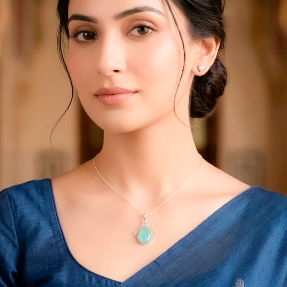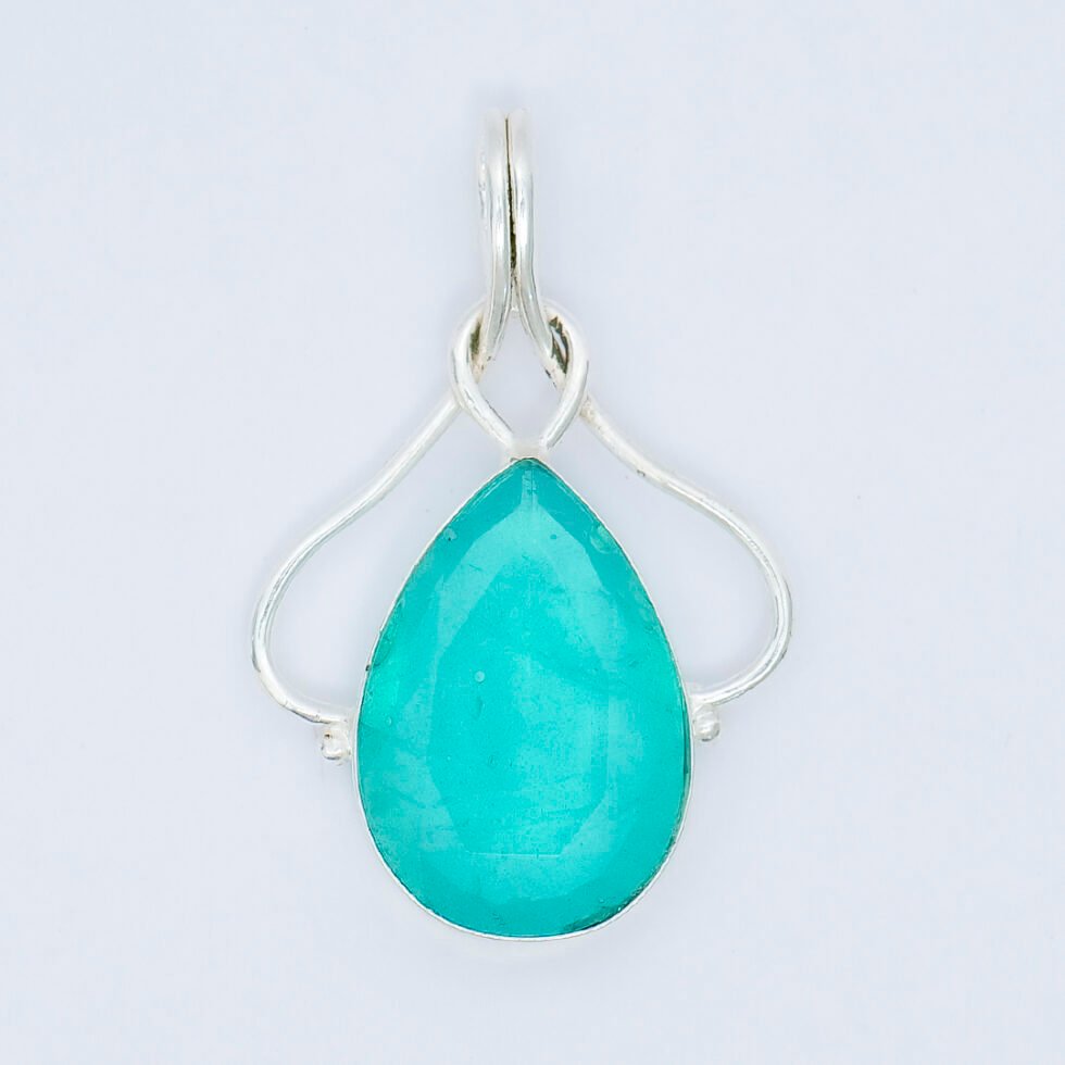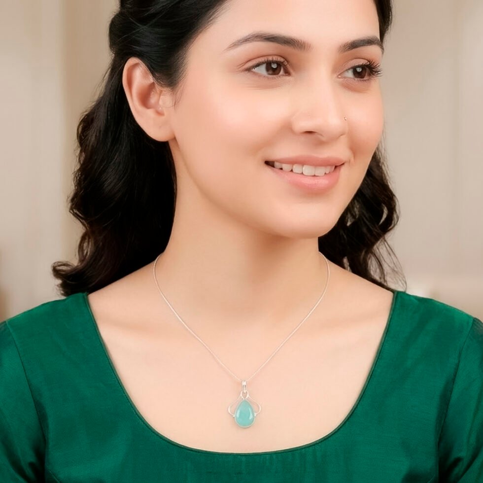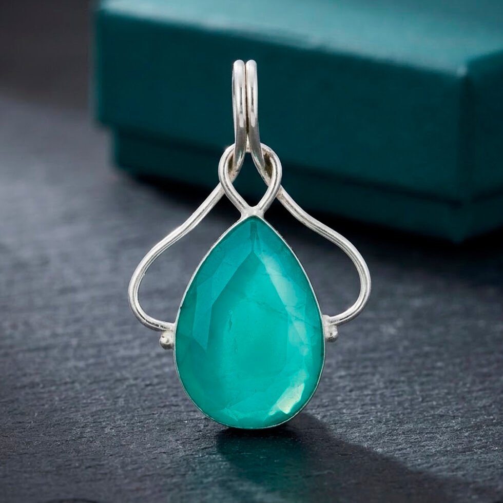 This pendant features a teardrop-shaped green onyx gemstone with a smooth, polished cabochon finish that highlights its vibrant blue-green color. The stone is set in a simple and elegant silver frame , which subtly outlines the shape without overpowering it. The overall design is minimalist and refined, emphasizing the natural beauty of the gemstone while offering a clean, timeless look suitable for everyday wear or light accessorizing.