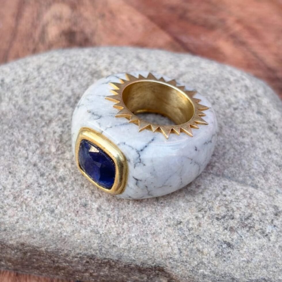 This is a bold, sculptural statement ring featuring a thick, rounded band made from a white marbled stone . The ring is accented with a deep blue Sapphire, faceted gemstone set in a gold bezel on one side, creating a striking contrast against the pale band. The inner rim is lined with gold, and the top edge features a decorative sunburst or gear-like pattern, adding an artistic, modern touch. Its chunky design and mixed materials make it a distinctive fashion piece rather than a traditional fine jewelry ring.