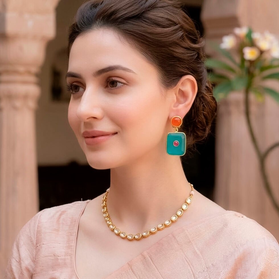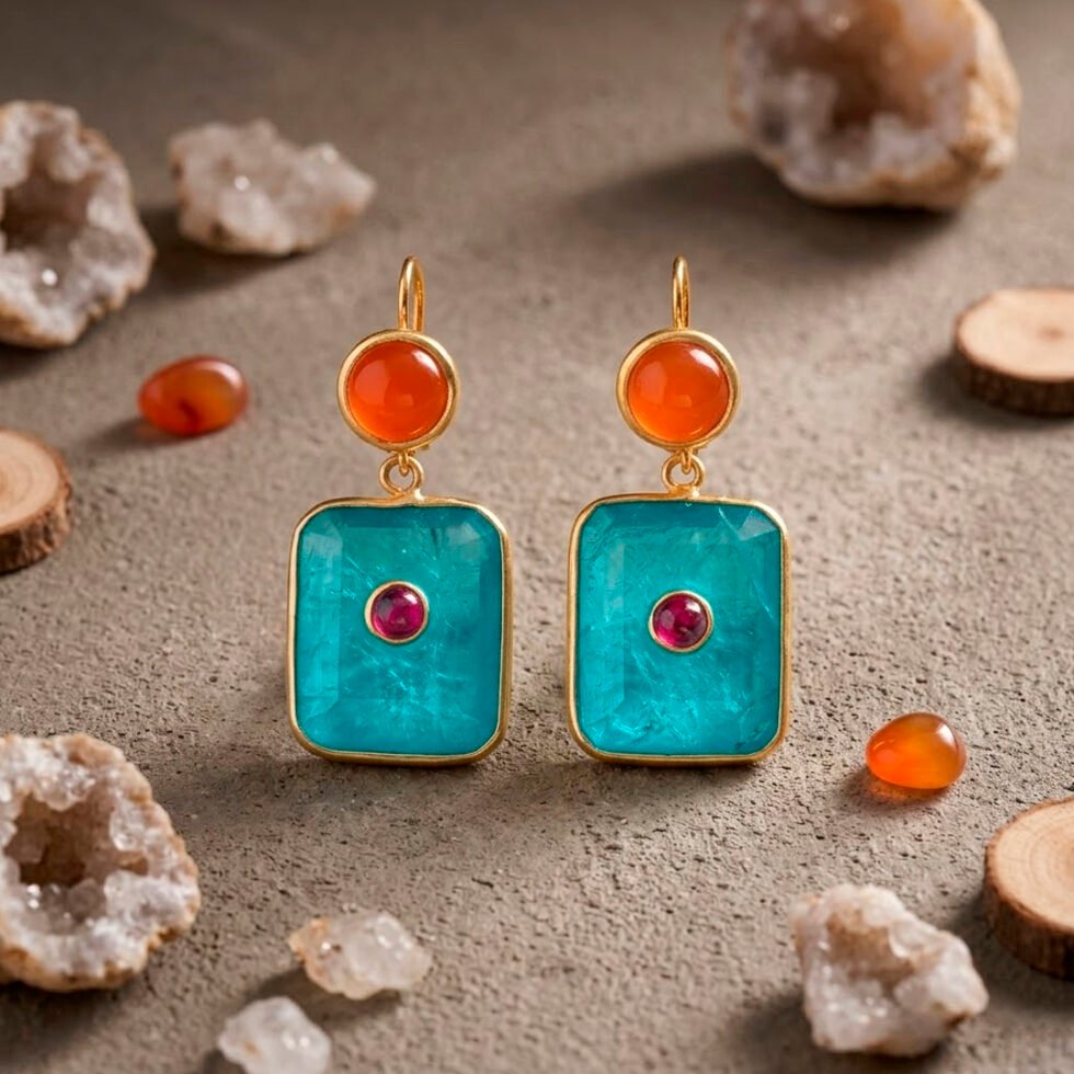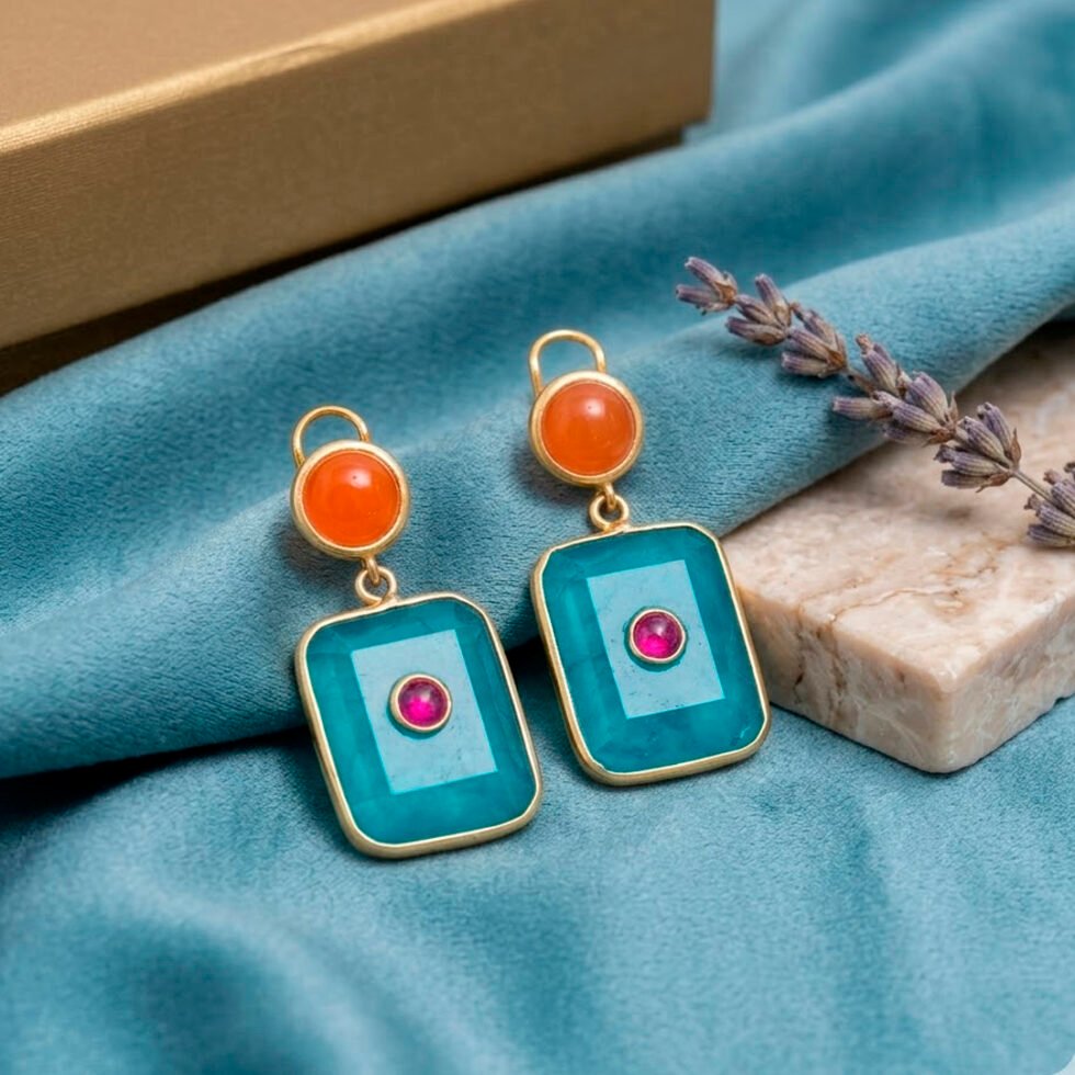 These earrings feature a vibrant multi-stone design, with a round orange onyx cabochon at the top and a rectangular Paraiba Tourmaline stone suspended below, accented by a small contrasting red ruby gemstone at the centre. Set in a gold-toned frame sterling silver , the earrings hang in a drop/dangle style, creating gentle movement and drawing attention to their bold color combination.