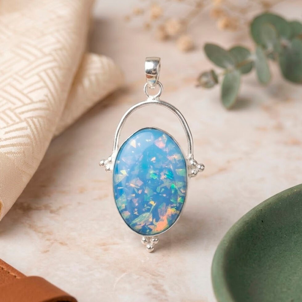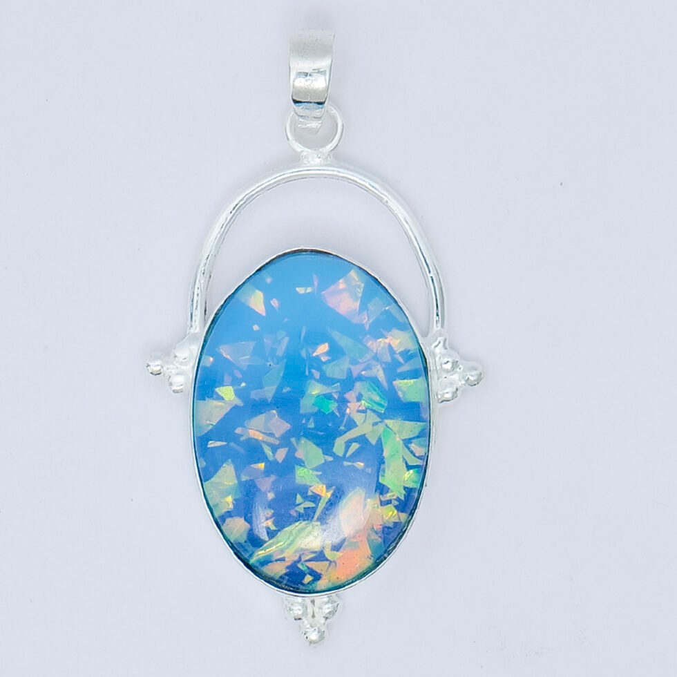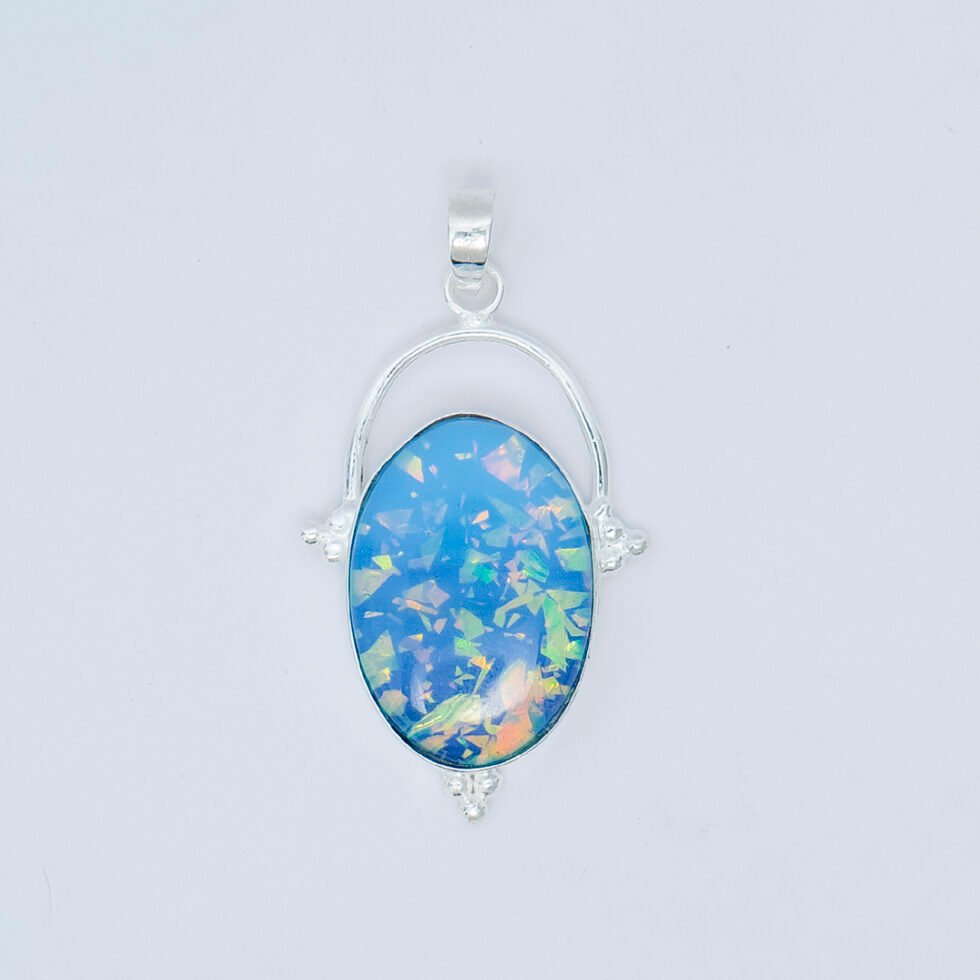 This pendant features an oval-shaped blue opal gemstone with a captivating play of colors, displaying flashes of light blue, green, and subtle iridescent tones. The stone has a smooth, polished surface that enhances its luminous appearance and is set in a simple silver bezel setting. A small bail at the top allows it to hang gracefully from a chain, creating a clean and elegant drop style. The overall design is minimalist and refined, highlighting the opal’s natural beauty while offering a delicate, timeless look suitable for everyday wear.
