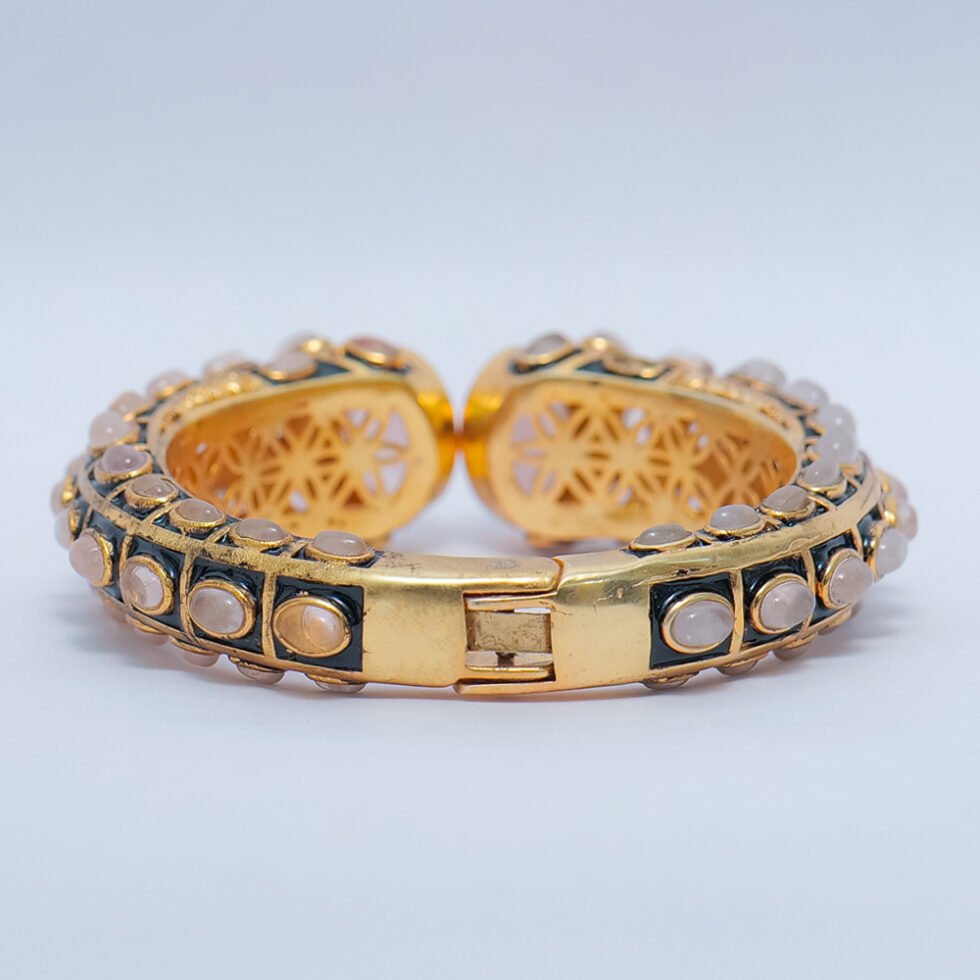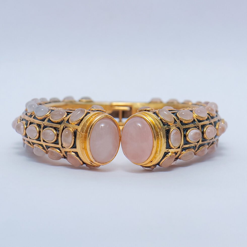 A beautiful rose quartz gemstone set in a gold-plated bangle with striking black enamel detailing. This elegant design blends soft feminine energy with bold modern contrast, making it a perfect statement piece for both daily wear and special occasions. Lightweight, stylish, and gracefully unique.