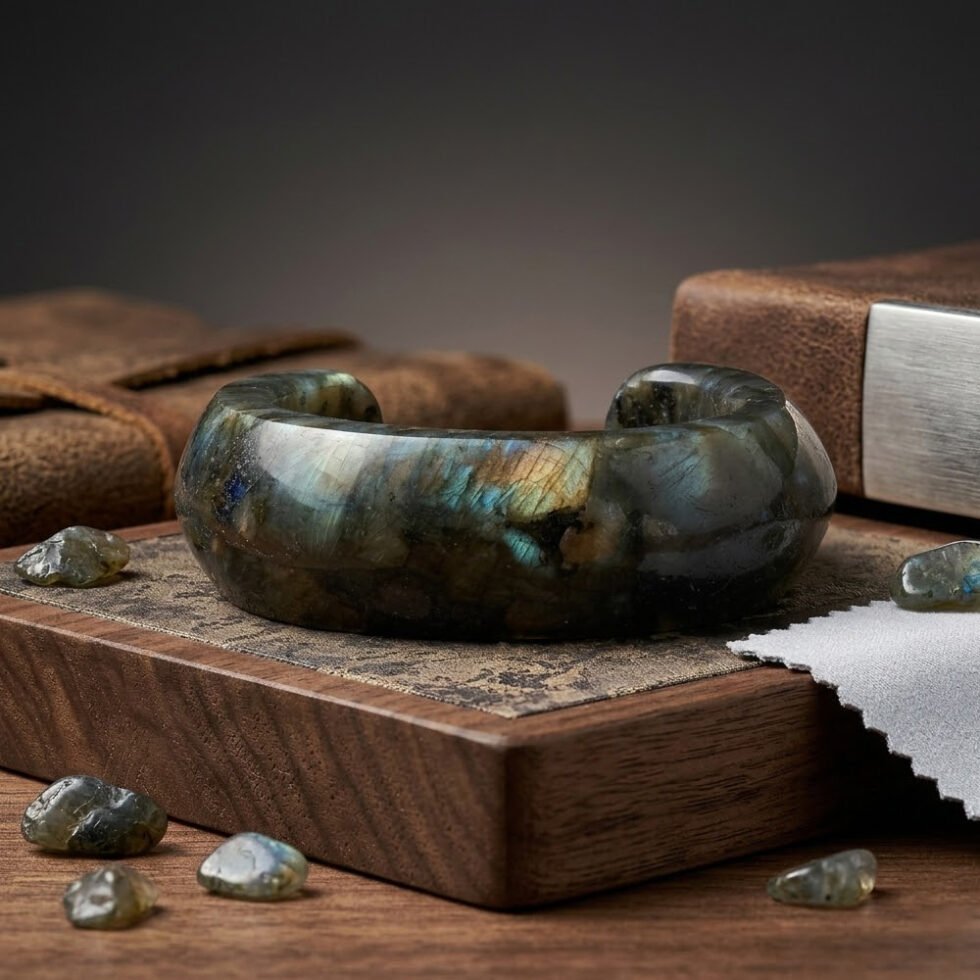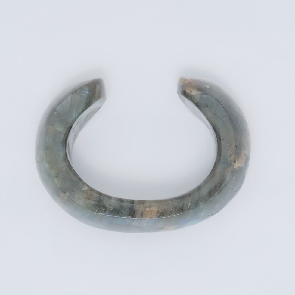 A stunning labradorite cuff bangle featuring mesmerizing flashes of color in a sleek open design. Bold yet elegant, this unique piece adds a touch of magic to everyday wear or special occasions.