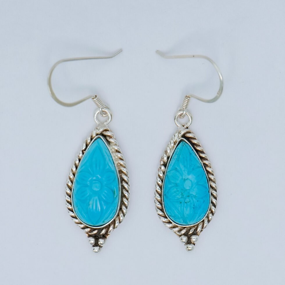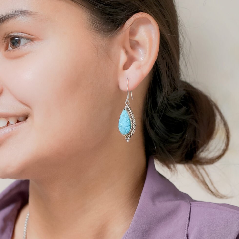 These handmade earrings feature vibrant turquoise stones set in high-quality 925 sterling silver, craftsmanship with natural beauty. Each piece highlights the unique character of the turquoise, with its captivating blue-green hues and organic variations that make every pair one of a kind. The polished silver setting complements the stone perfectly, adding a subtle shine while maintaining a rustic, handcrafted feel. Lightweight yet eye-catching, these earrings offer a perfect balance of elegance and bohemian charm, making them ideal for both everyday wear and special occasions.