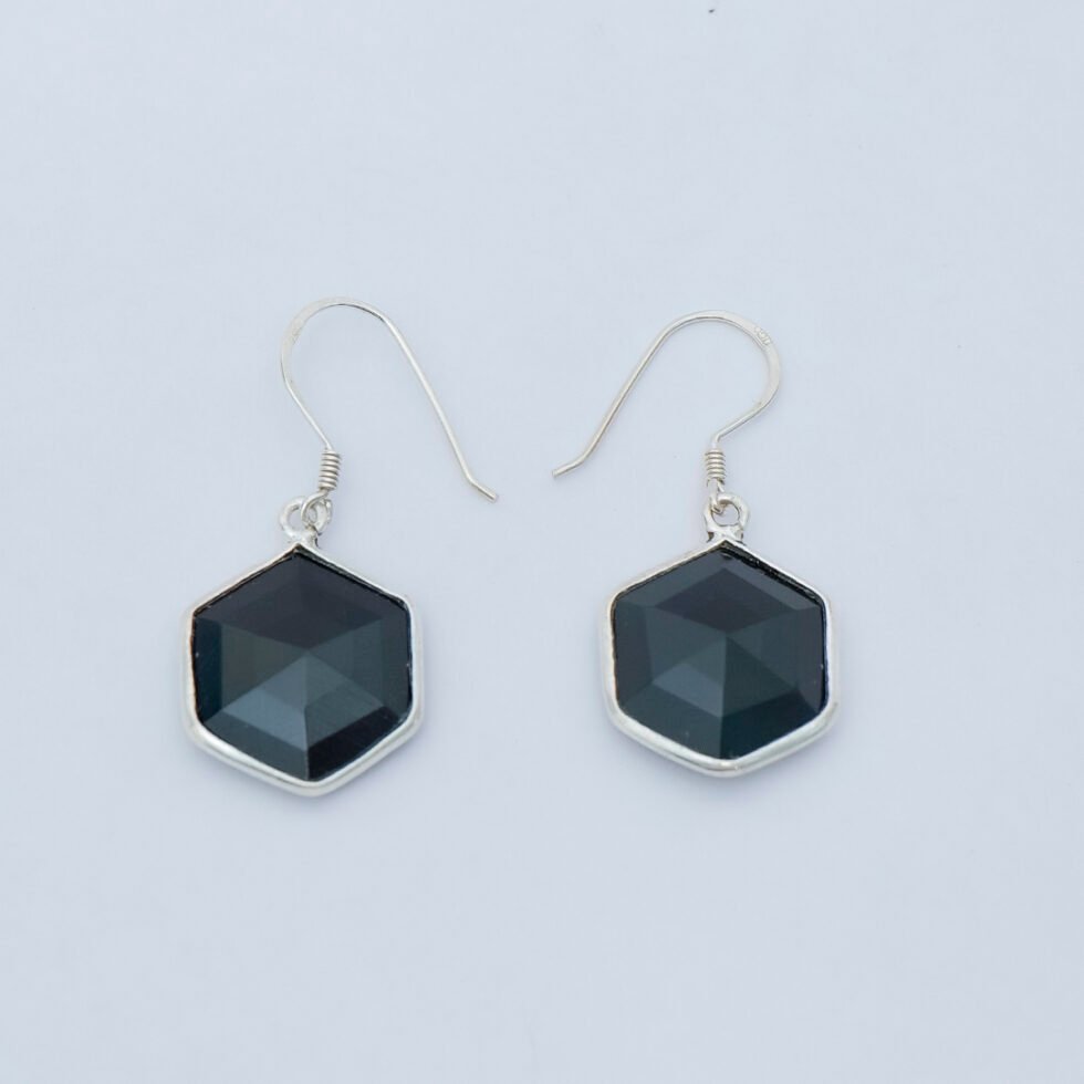 These earrings feature faceted black onyx hexagon-shaped stones set in a sleek 925 silver frame, suspended from simple hooks in a minimalist drop style. Their clean geometric design and deep black color give them a modern, elegant look suitable for both casual and formal wear.